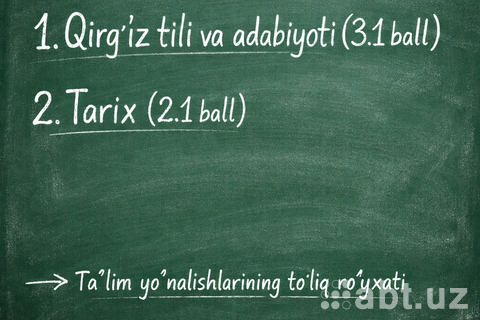 Quyida Qirg‘iz tili va adabiyoti (3.1 ball) va Tarix (2.1 ball) fanlari majmuasiga mos ta’lim yo‘nalishlari hamda ularning kodlari keltirilgan: