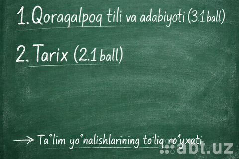 2026/2027 o‘quv yili uchun davlat oliy ta’lim tashkilotlariga kirish imtihonlarida Qoraqalpoq tili va adabiyoti (3.1 ball) va Tarix (2.1 ball) fanlari majmuasi bo‘yicha jami 1 ta ta’lim yo‘nalishi mavjud.