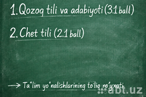 Quyida Qozoq tili va adabiyoti (3.1 ball) va Chet tili (2.1 ball) fanlari majmuasiga mos ta’lim yo‘nalishlari hamda ularning kodlari keltirilgan: