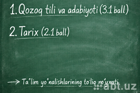 2026/2027 o‘quv yili uchun davlat oliy ta’lim tashkilotlariga kirish imtihonlarida Qozoq tili va adabiyoti (3.1 ball) va Tarix (2.1 ball) fanlari majmuasi bo‘yicha jami 1 ta ta’lim yo‘nalishi mavjud.