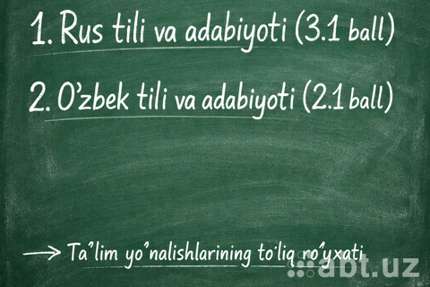 Quyida Rus tili (3.1 ball) va O‘zbek tili va adabiyoti (2.1 ball) fanlari majmuasiga mos ta’lim yo‘nalishlari hamda ularning kodlari keltirilgan:
