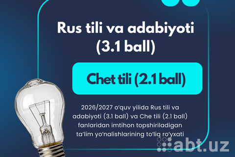 2026/2027 o‘quv yili uchun davlat oliy ta’lim tashkilotlariga kirish imtihonlarida Rus tili va adabiyoti (3.1 ball) va Chet tili (2.1 ball) fanlari majmuasi bo‘yicha jami 1 ta ta’lim yo‘nalishi mavjud.