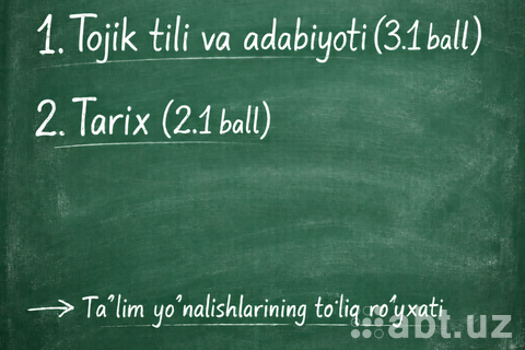 Quyida Tojik tili va adabiyoti (3.1 ball) va Tarix (2.1 ball) fanlari majmuasiga mos ta’lim yo‘nalishlari hamda ularning kodlari keltirilgan: