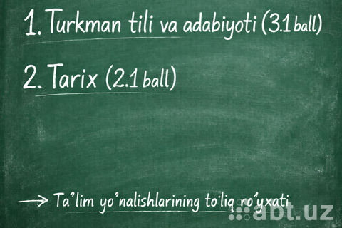 Quyida Turkman tili va adabiyoti (3.1 ball) va Tarix (2.1 ball) fanlari majmuasiga mos ta’lim yo‘nalishlari hamda ularning kodlari keltirilgan: